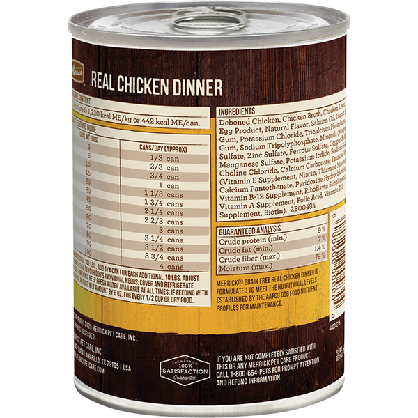 Dogs thrive on quality protein and healthy fats. That is why our Merrick Grain Free Real Chicken Canned Dog Food’s first ingredient is real and wholesome USDA-inspected deboned chicken. This grain-free, fresh entrée is 96% meat with all the vitamins and minerals your dog needs for complete nutrition. Our grain-free canned recipes can be served as a topper for dry kibble or a delicious standalone meal.